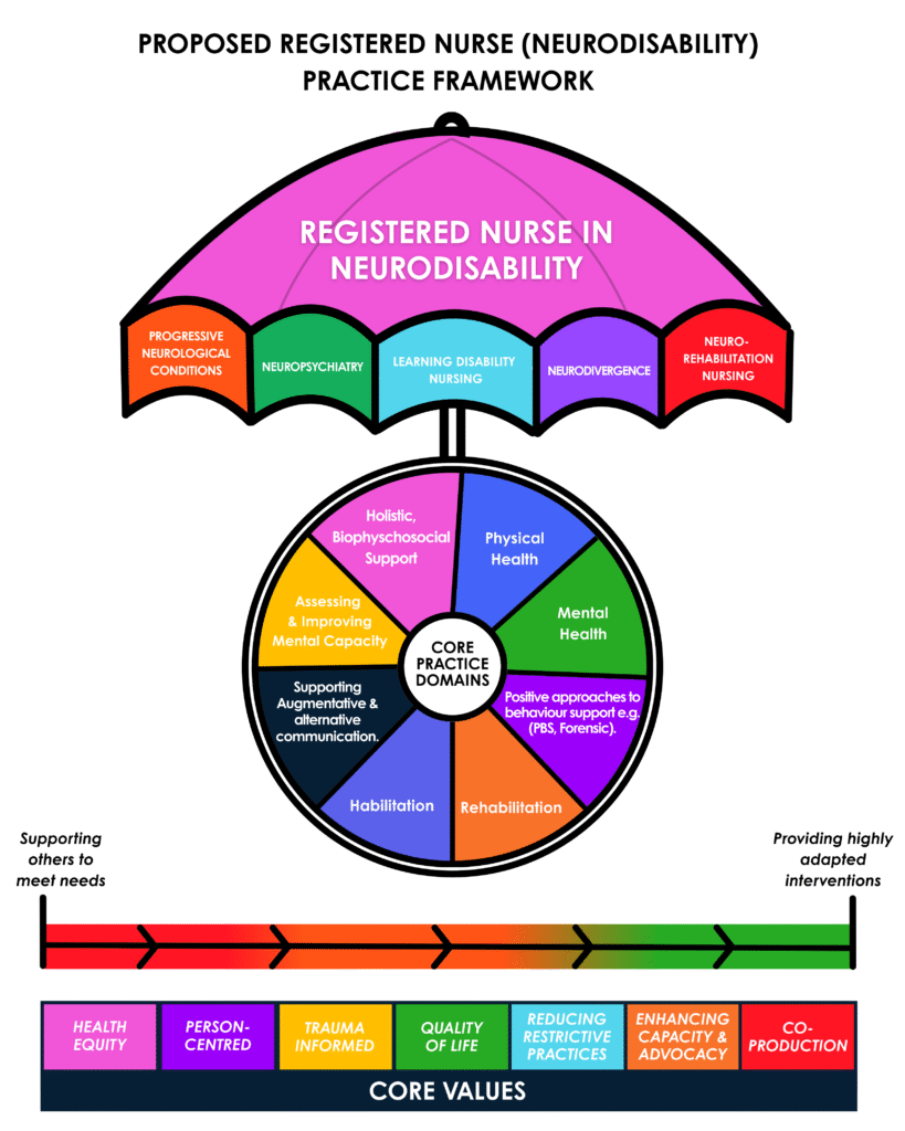 This image depicts the vision for a framework for Registered Nurses in Neurodisabilities. Learning Disability Nursing remains a core, specific and distinct field of practice under this registration – similar to how cancer nursing practice is a field of practice for Registered Nurses for Adults. It opens doors for us that many RNLDs face as closed presently in other areas of neuroscience practice. The core domains we have are equally relevant to learning disabilities as they are to neuro-rehabilitation or any other area. Our scope of practice ranges from enabling other services to meet peoples need to providing our own specific interventions. And there are core values that underpin what we do.